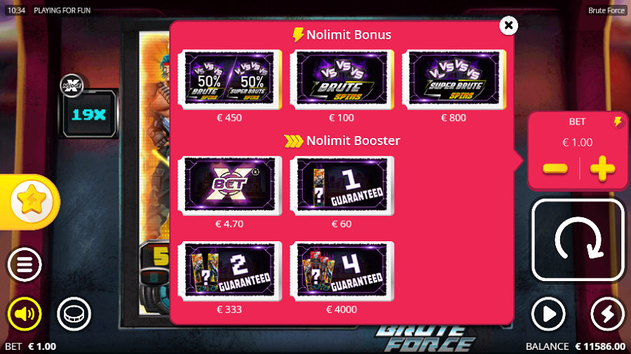 Exclusive access can be gained through the purchase of a variety of special features. 100 times the stake will buy you the Brute Spins, and 800 times the bet is needed for the Super Brute Spins. If the Lady Luck chooses to give either Brute Spins or Super Brute Spins with a 50% probability each, then you are going to pay 450x your bet.