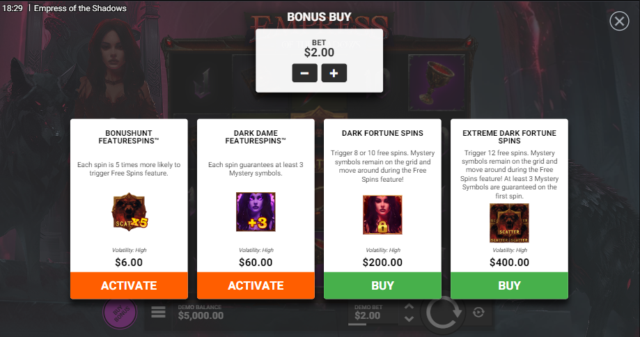 The dark lady is waiting for you. The features in Empress of the Shadows are Wild Symbol, Mystery Symbol, Dark Fortune Spins, and Feature Buy.